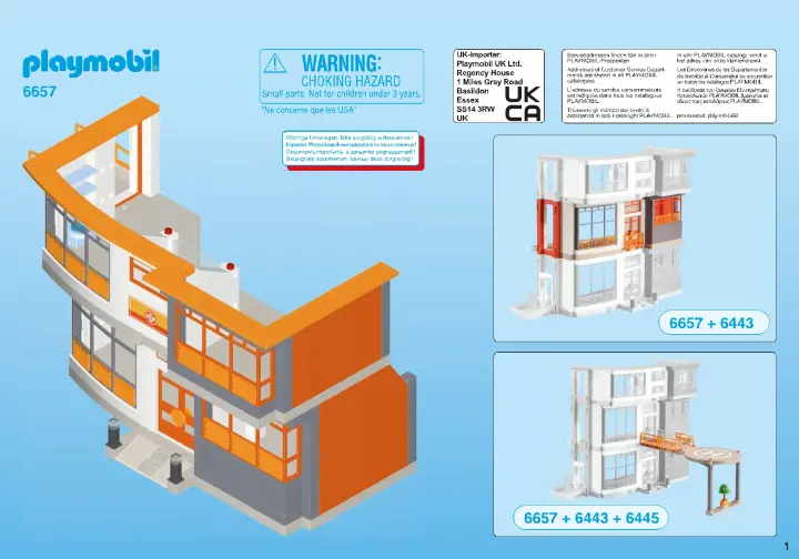 - Im Erdgeschoss befinden sich die Patientenaufnahme und der Zugang zum Aufzug. - Mit der doppelflügeligen Tür führen von außen sowohl Treppenstufen als auch eine Auffahrrampe für Rollstühle und Kinderwägen in den Eingangsbereich. - Über den Aufzug gelangt man in das Obergeschoss. Er ist so gestaltet, dass jeweils ein Krankenbett problemlos transportiert werden kann. Operationssaal: - Die beiden Liegeflächen der Behandlungsliege können jeweils stufenlos aufgerichtet werden. An einer Stirnseite ist der Infusionsständer befestigt. Über die Infusionsmanschette wird der Schlauch und die Infusionsflasche am Arm der Figur befestigt (bei Kinder- und Erwachsenenfiguren möglich). - An der Wand ist eine OP-Leuchte fixiert, die durch das Schwenkgestänge in alle Richtungen beweglich ist. - Links in der Wand befinden sich die Apparaturen mit Defibrillator und Beatmungsgerät. - Die Patienten können mit den enthaltenen Pflasteretiketten beliebig beklebt werden. Kinderkrankenzimmer: - Das Kinderkrankenbett ist ausschließlich für Kinderfiguren geeignet und lässt sich schieben. Die beiden Gitter können abgenommen werden. Babystation: - Das Babybett lässt sich schieben. - Das Babyzimmer ist mit einer herausnehmbaren Babywanne, einem Wickeltisch, einer Babywaage, einem Flaschenwärmer und einem Töpfchen ausgestattet. Toilette: Zwischen dem Kinder- und dem Babyzimmer wurde die Toilette mit Waschbecken integriert. Mit dem zusätzlichen Toilettenaufsatz können die Kinderfiguren auf dem WC sitzen.