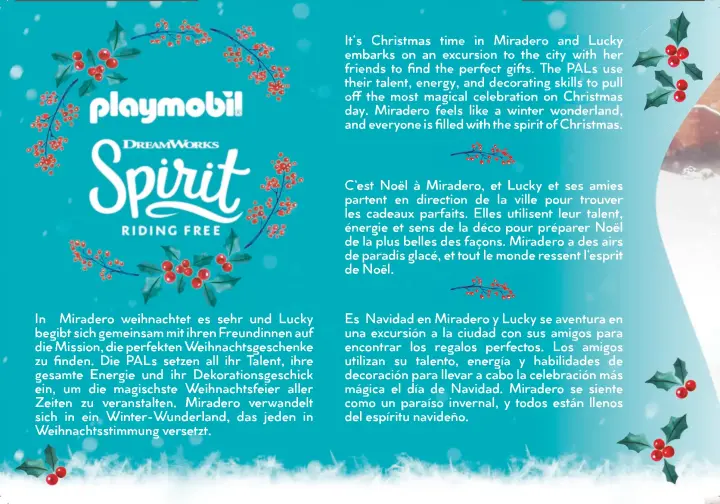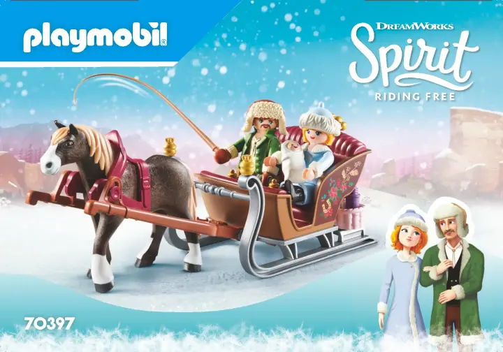 Zur Weihnachtszeit ist in Miradero viel Schnee gefallen. Alles ist in winterliches Weiß gehüllt. Vater Jim und seine Frau Kate machen mit dem neuesten Familienmitglied, Baby Polly, einen Familienausflug durch das traumhafte Winterwunderland und hat dafür extra den Schlitten angespannt. Alle einsteigen und los geht die fröhliche Fahrt. Baby Polly liegt warm eingepackt in den Armen von Mama Kate und gurgelt vergnügt vor sich hin. Was für wundervolle Miradero-Weihnachten! Das Spielset enthält Mama Kate und Vater Jim im Winteroutfit mit Mützen und Baby Polly, sowie ein Pferd einen Schlitten und einen Korb mit Thermoskanne und Tasse.