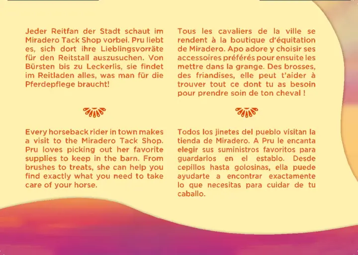 Die abenteuerlustige Pru ist eine echte Pferdeexpertin. Ihr Vater ist Pferdezüchter und so ist Pru von klein auf mit Pferden in Berührung. Sie weiß alles über die richtige Pflege, das passende Zubehör und verschiedene Reittechniken. In ihrem bestens ausgestatteten Reitladen finden Pferdefreunde alles, was das Herz begehrt: Sattel, Zaumzeug, Pferdedecken, Pflegeutensilien - es bleiben keine Wünsche offen. Tolle Tipps und Tricks für die ideale Pferdepflege gibt es bei Pru natürlich gratis dazu. Der Miradero Reitladen ist das Geschäft für alle Pferdefreunde in und um Miradero. Das Spielset enthält Pru und ein Pferd, einen Reitladen mit Kasse und Regalen für Reitzubehör, Sattel, Pferdedecken, Bürsten, Zaumzeug und viele weitere tolle Extras für Pferdefreunde. Die Figur kann mit ihrem flexiblen Rock auf dem Pferd reiten.
