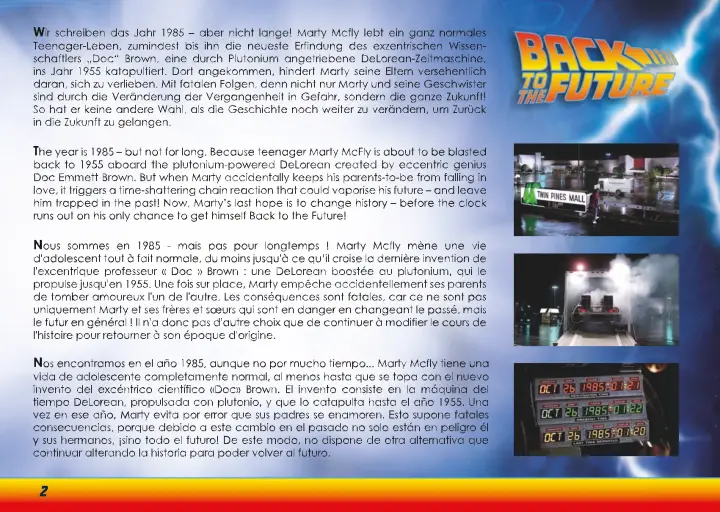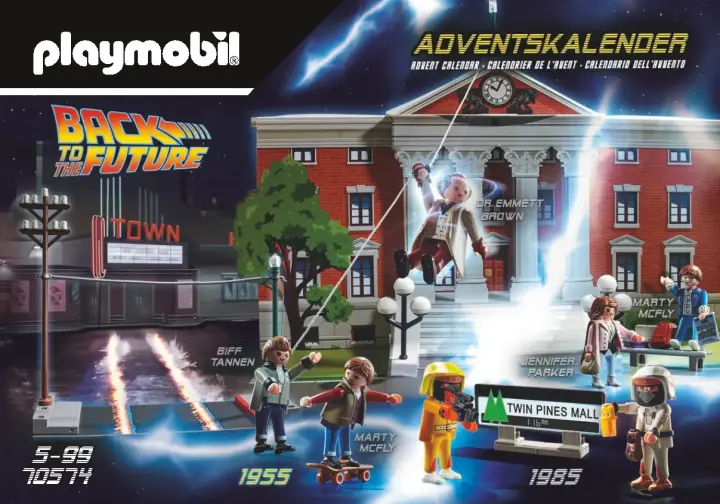Ξεκινήστε την αντίστροφη μέτρηση για τα Χριστούγεννα με το συναρπαστικό Χριστουγεννιάτικο Ημερολόγιο PLAYMOBIL "Back to the Future"! Πίσω από κάθε "πόρτα" υπάρχει ένα δώρο, από φιγούρες και οχήματα έως απίθανα αξεσουάρ, χαρίζοντας στα παιδιά (αλλά και στους ενήλικες) ατελείωτες ώρες διασκέδασης μέχρι τα Χριστούγεννα. Μόλις αποκαλυφθούν όλες οι εκπλήξεις, το κουτί μετατρέπεται σε ένα σκηνικό για να δημιουργήσετε την πλατεία της πόλης. Αναπαραστήστε σκηνές από το Back to the Future και το Back to the Future II! Περιλαμβάνει τους Marty McFly και Jennifer Parker, και τους Doc Brown και Marty στο χώρο στάθμευσης Twin Pines Mall από το 1985. Οι μεγάλοι θαυμαστές της ταινίας μπορούν να ταξιδέψουν πίσω στον χρόνο και συγκεκριμένα στη δεκαετία του 1950, όπου ο Marty μπορεί να ξεφύγει από τον Biff με το skateboard του. Είναι σχεδόν 10:04 και ο Doc Brown πρέπει να φτάσει στον πύργο του ρολογιού, να χρησιμοποιήσει τον κεραυνό και να τον διοχετεύσει στον πυκνωτή ροής! Επιπλέον, κάθε ημερολόγιο συνοδεύεται από μια τρισδιάσταση, φακοειδής εικόνα. Δείτε την οικογένεια McFly να εξαφανίζεται μπροστά στα μάτια σας!