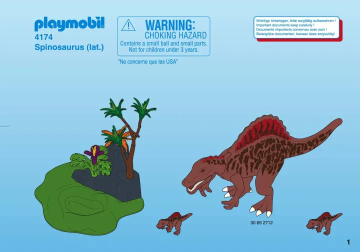 Avec 2 explorateurs et 3 spinosaures (2 bébés). Comporte de nombreux accessoires scientifique : stéthoscope, loupe, un ordinateur portable, une pince, une seringue…Les pattes du spinosaure sont mobiles et sa mâchoire s'ouvre. Effet réaliste avec une langue qui bouge.