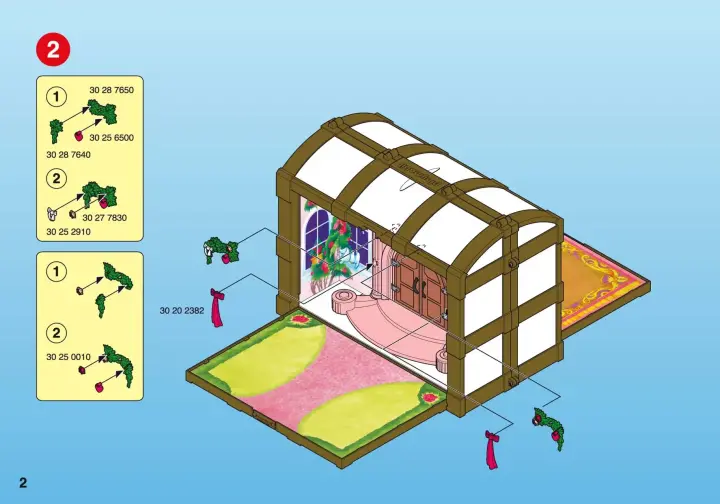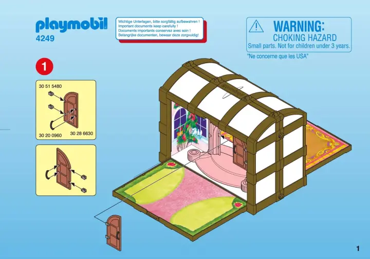 Comprend la chambre et le jardin de la princesse avec une porte communiquante. Avec de nombreux accessoires et de nombreux animaux : poulain, oiseaux, perroquet et chatons. Le coffre s'ouvre des deux côtés pour jouer. Dimensions : 34 x 18/54 x 25 cm (LxPxH fermé/ouvert).