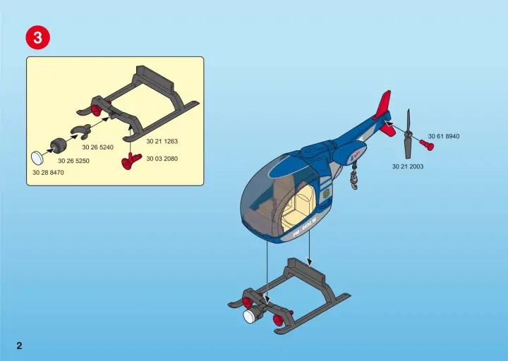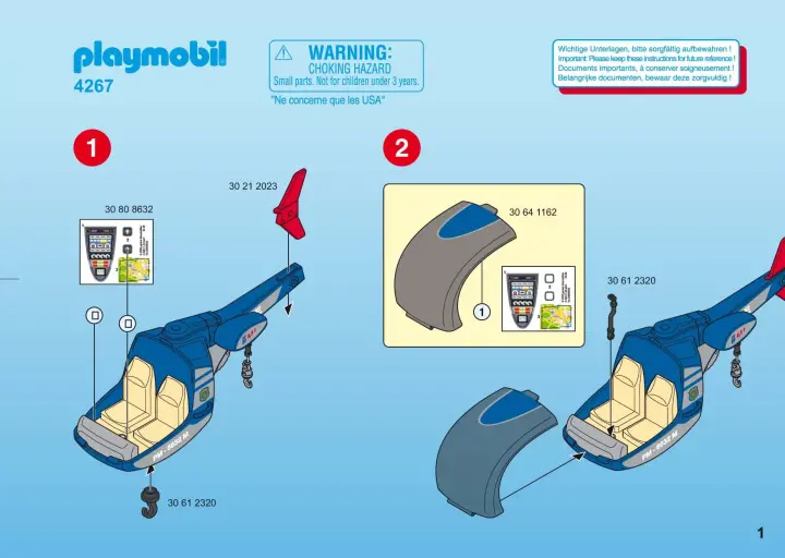 Avec deux personnages, un hélicoptère et de nombreux accessoires. Hélicoptère avec une ouverture à l'avant et un treuil fonctionnel. L'hélice tourne.