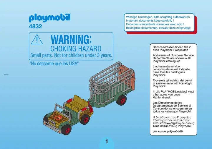 Avec un personnage et un rhinocéros. La rampe de la cage est rabattable. Les grilles sont amovibles. Le véhicule est équipé d'une roue de secours.