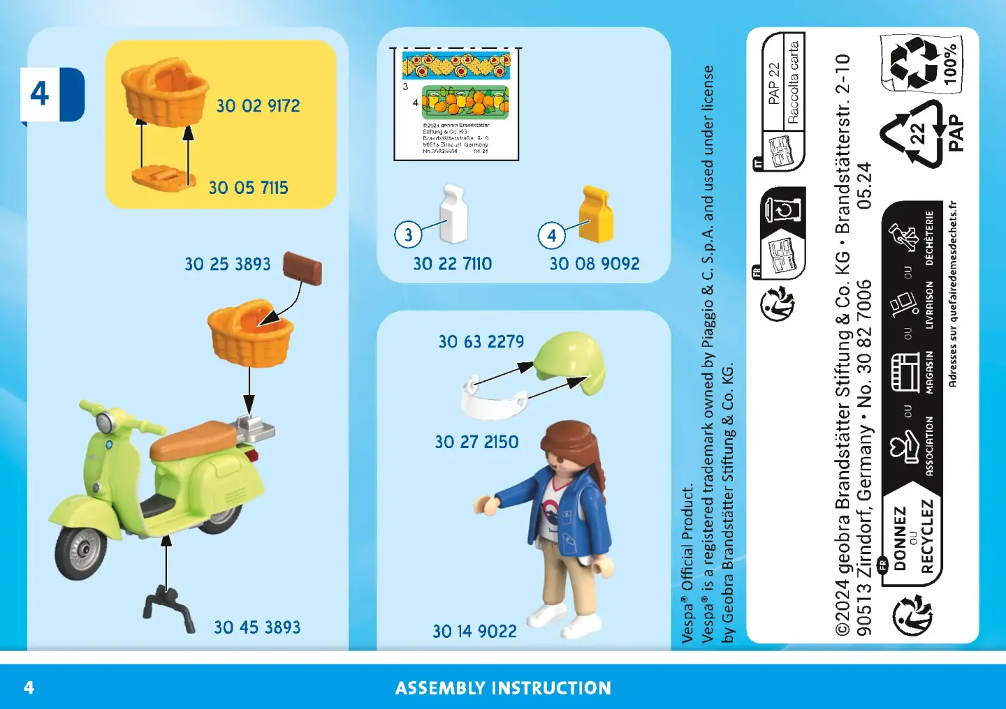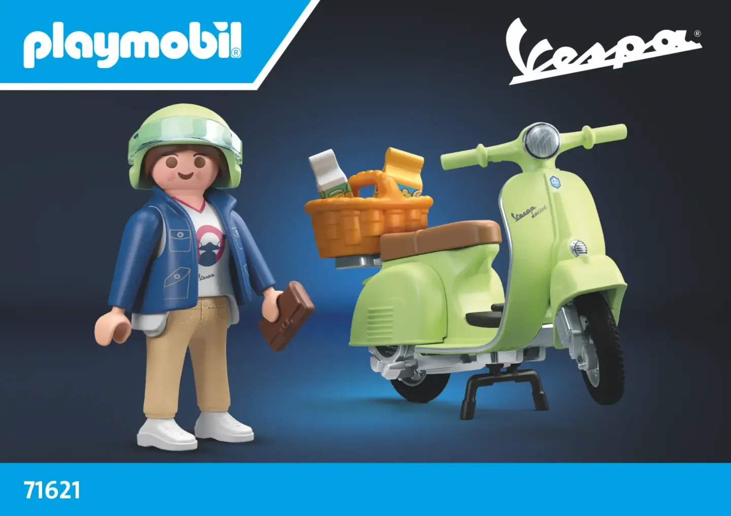 Vespa wordt geleverd met twee varianten zadels - een originele en een om het beeldje op te laten zitten.Het boodschappenmandje kan worden verwijderd. Spring op de Vespa 150 Sprint Veloce uit 1969 in lichtgroen van PLAYMOBIL! Geïnspireerd door het Piaggio scootermodel Vespa 150 Sprint Veloce, combineert deze authentieke PLAYMOBIL Vespa charme met tijdloze elegantie. De liefdevol vormgegeven Vespa wordt gecompleteerd door een PLAYMOBIL figuur en verschillende accessoires. Boodschappen en portemonnee kunnen worden opgeborgen in de mand achter het zadel. Met de verschillende zadelvarianten, met en zonder figuurzitting, kan de scooter worden aangepast. Of je nu een ervaren rijder bent of een beginner, deze set is perfect voor zowel kinderen als volwassen Vespa-fans. Ervaar de geest van de weg met de iconische 1969 Vespa 150 Sprint Veloce in lichtgroen van PLAYMOBIL!
