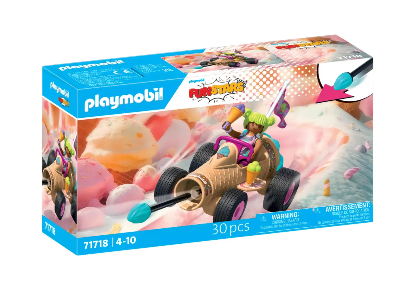 Met de PLAYMOBIL Funstars-set “Race-ijshoorntje” wordt elk racecircuit een zoete uitdaging! Het ijshoorntje heeft een werkend kanon aan de bovenkant dat ijsballen schiet – perfect voor een zoete puinhoop of als verrassend geheim wapen. Natuurlijk heeft de ijsverkoopster altijd een paar ijshoorntjes bij zich voor fans langs de kant van de baan. Of het nu gaat om chaotische ijsgevechten of wilde races - het "race-ijshoorntje" zorgt voor fantasierijk speelplezier voor kinderen vanaf 4 jaar! Maak je klaar voor de smakelijkste race van het jaar met de PLAYMOBIL Funstars Racing IJshoorn! Deze heerlijke dessertwagen zoeft over de baan met een wervelwind aan plezier en een knal vol zoete verrassingen. Uitgerust met een werkend ijsjeskanon is hij perfect voor grappige voedselgevechten of smakelijke teamoverwinningen. De ijsjesracer is helemaal in stijl gekleed – met een hoornvormige pet en kleurrijke accessoires. Met deze vrolijke PLAYMOBIL-set bedenken kinderen vanaf 4 jaar de gekste races en strooien ze elke speelsessie vol met plezier en gelach!