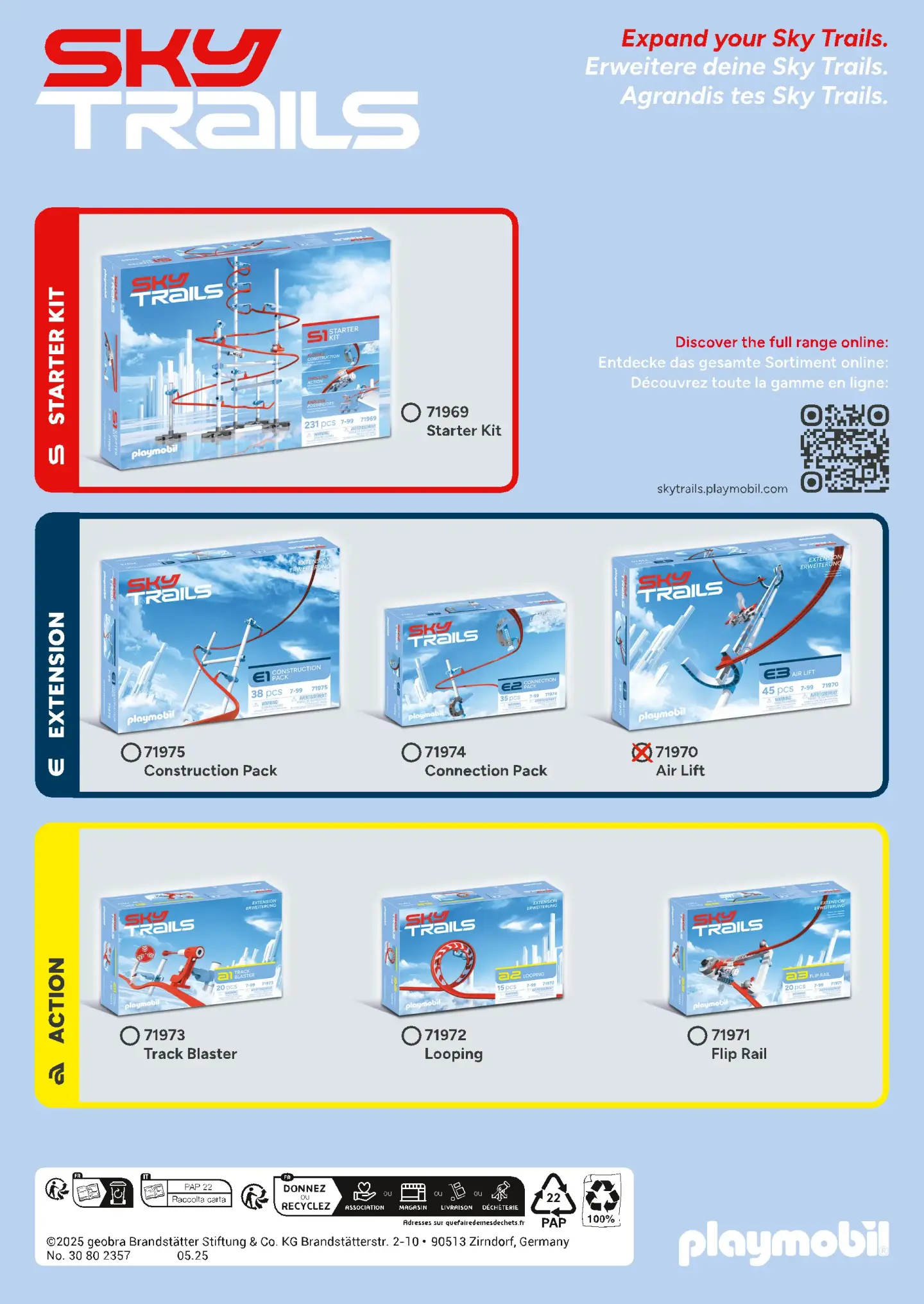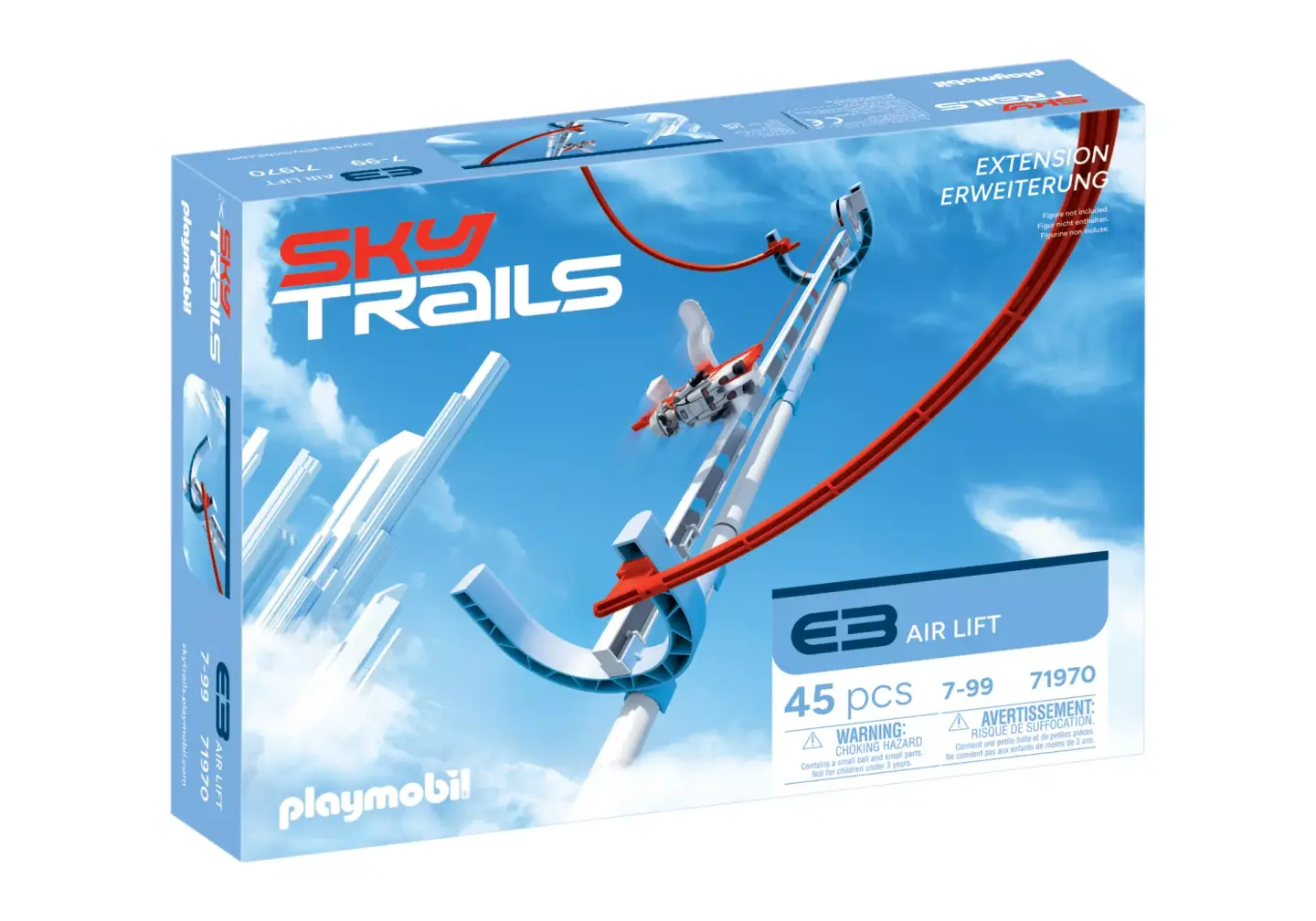 Met de PLAYMOBIL Sky Trails Air Lift voeg je extra snelheid en spanning toe aan je parcours. Til je Sky Rider naar een hoger niveau en verbind verschillende delen van je Sky Trails voor creatieve banen. Gebruik één of meerdere Air Lifts om nieuwe hoogten te bereiken en langere, steilere afdalingen te maken. Perfect om je Sky Trails uit te breiden met meer uitdagingen en speelplezier. Ideaal voor kinderen die houden van bouwen, snelheid en spannende avonturen op hoogte. Til je SKY TRAILS-avontuur naar een hoger niveau De SKY TRAILS Air Lift breidt je actievolle wereld uit met een spannende nieuwe uitdaging. Met twee ingangen kun je de lift aan beide kanten aansluiten en meerdere banen met elkaar verbinden. Deze uitbreiding is compatibel met de PLAYMOBIL SKY TRAILS Starter Kit 71969 en dus essentieel voor geavanceerde opstellingen. Bouw groter, hoger en gedurfder en laat je Sky Rider elke keer weer nieuwe avonturen beleven. Til je avontuur naar een hoger niveau Met de Air Lift bereikt je Sky Rider in enkele seconden nieuwe hoogtes. Bouw steile afdalingen en spannende parcours die elke speelsessie boeiend maken. Flexibel ontwerp voor creatief spel Dankzij de dubbele ingang kan de lift aan beide zijden worden aangesloten. Hierdoor past hij eenvoudig in elk SKY TRAILS-baanontwerp. Oneindige actie met uitbreidingen Combineer één of meerdere Air Lifts voor langere ritten, hogere constructies en snellere afdalingen. Breid je SKY TRAILS-wereld uit en beleef eindeloos nieuwe avonturen. Belangrijkste Kenmerken Voeg spannende hoogte toe aan je baan De SKY TRAILS Air Lift geeft je baan direct hoogte. Met één of meerdere liften bouw je hogere opstellingen en spannende nieuwe routes. Verbind eenvoudig meerdere secties Dankzij het ontwerp met dubbele ingang verbind je eenvoudig banen vanaf beide kanten. Bouw flexibele lay-outs en ontdek eindeloze bouwmogelijkheden. Breid je creativiteit uit met geavanceerde opstellingen Combineer de Air Lift met de SKY TRAILS Starter Kit 71969 en extra uitbreidingen. Elke toevoeging opent de deur naar grotere en stoerdere avonturen.