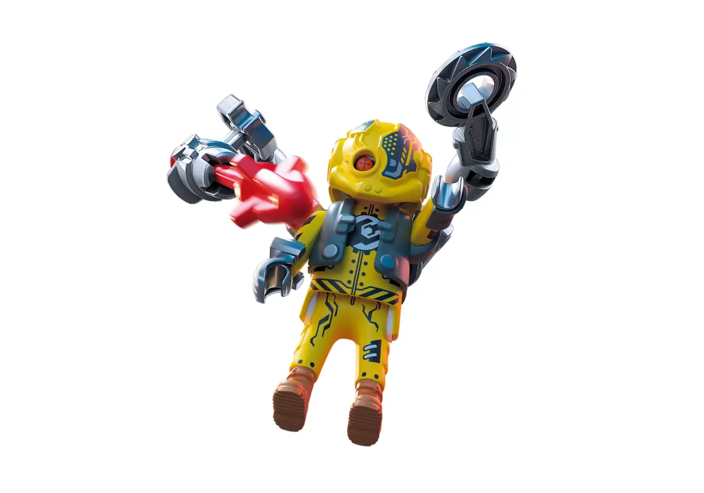 PLAYMOBIL Heroes: Mr. Mechanic – Robotens hjälte En av fyra samlarhjältar i PLAYMOBIL Heroes-serien – perfekt för att utöka ditt lag av hjältar och skurkar! Den cybernetiska uppfinnaren och robothjälten Mr. Mechanic imponerar med sitt exoskelett och två kraftfulla robotarmar. Med sin avtagbara armkanon kan han skjuta raketprojektiler för att enkelt övervinna hinder eller fiender. Hans unika hjälm avslöjar hans karaktäristiska cyborg-öga – en symbol för hans obevekliga vilja att erövra PLAYMOPOLIS. Tandhjul snurrar och gnistor flyger – Mr. Mechanic, Robot-Hjälten, är på gång! Med sina kraftfulla robotarmar och avtagbar armkanon är denna teknikspecialist redo för farliga uppdrag och mekaniskt kaos. Hans slimmade exoskelett anpassar sig till alla utmaningar, medan basplattan håller honom stabil under actionfyllda stunder. Den cyborgliknande blicken under hjälmen skvallrar om styrkan bakom maskinen. Denna futuristiska PLAYMOBIL-figur har detaljrika tillbehör och uppfinningsrika funktioner. En av fyra samlingsbara hjältar – ett måste för varje fan som vill stärka sitt hjälte-team!
